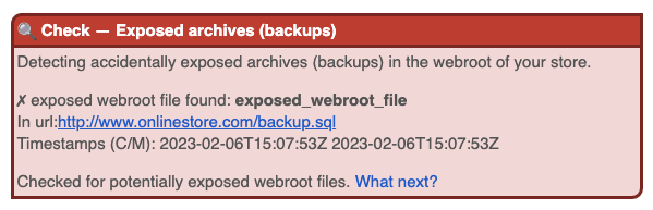 - Monitor for accidentally exposed files in the future, with an automated security scanner, like Sansec’s eComscan. Sansec has added alerting for this problem in the latest eComscan version, 1.4.42.